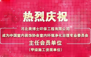 熱烈慶祝河北美博士環(huán)保工程有限公司成為中國室內裝飾協(xié)會(huì )室內環(huán)境凈化治理專(zhuān)業(yè)委員會(huì )主任會(huì )員單位。