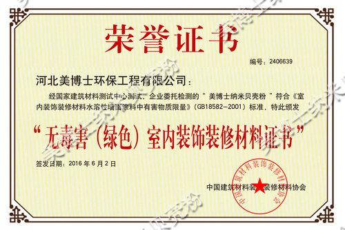美博士經(jīng)國家建筑材料測試中心,企業(yè)委托檢測的“美博士納米貝殼粉”符合《室內裝飾裝修材料水溶性墻面涂料中有害物質(zhì)限量》(GB18582-2001)標準,中國建筑材料裝飾裝修材料協(xié)會(huì )于2016年6月2日特此頒發(fā)了“無(wú)毒害(綠色)室內裝飾裝修材料證書(shū)”