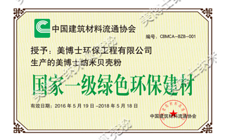 中國建筑材料流通協(xié)會(huì )又授予美博士納米貝殼粉國家一級綠色環(huán)保建材稱(chēng)號。有效日期從2016年5月19號到2018年5月18號。