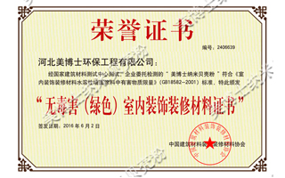 美博士經(jīng)國家建筑材料測試中心,企業(yè)委托檢測的“美博士納米貝殼粉”符合《室內裝飾裝修材料水溶性墻面涂料中有害物質(zhì)限量》(GB18582-2001)標準,中國建筑材料裝飾裝修材料協(xié)會(huì )于2016年6月2日特此頒發(fā)了“無(wú)毒害(綠色)室內裝飾裝修材料證書(shū)”。